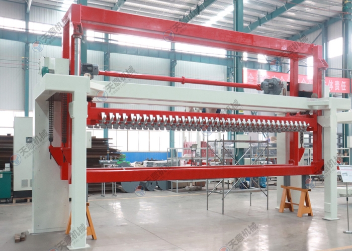 脫模后的坯體連同側(cè)板一起放置在切割小車上,切割小車由減速電機(jī)驅(qū)動(dòng)行走,通過縱向切割機(jī)完成縱向切割,切割小車?yán)^續(xù)行走至橫向 切割機(jī)中間位置停止后,由小車置換裝置將側(cè)板連同坯體抬起,切割小車退回翻轉(zhuǎn)行車底下進(jìn)行下一次承載脫模后的坯體,另外一部切割小車 進(jìn)入置換裝置底下后, 置換裝置將側(cè)板連同坯體放置該切割小車上后,橫向切割動(dòng)作后啟動(dòng)進(jìn)行橫向切割動(dòng)作,切割完成后,切割小車再行走至確地行車底下,再由 翻轉(zhuǎn)去底行車將坯體去底(連側(cè)板)吊至蒸養(yǎng)小車上,切割小車范圍原始位置進(jìn)行下一個(gè)切割循環(huán)。