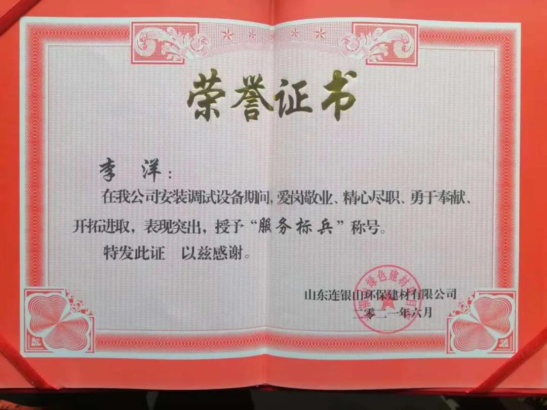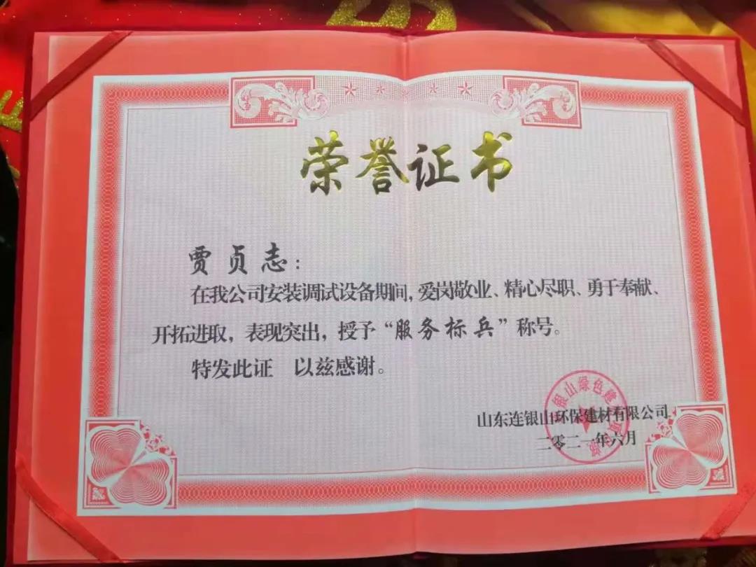 炎炎夏日,天意機(jī)械在向客戶山東連銀山環(huán)保建材有限公司售出保溫裝飾一體化板生產(chǎn)線之后,隨即派出售后團(tuán)隊(duì)對設(shè)備進(jìn)行安裝調(diào)試及售后培訓(xùn)。售后團(tuán)隊(duì)不畏酷暑,精心、耐心、專業(yè)地為客戶進(jìn)行安裝調(diào)試,贏得了客戶的好評和認(rèn)可,客戶為表達(dá)謝意,特授予天意機(jī)械售后人員榮譽(yù)證書和錦旗,以表彰售后人員愛崗敬業(yè)、精心盡職、勇于奉獻(xiàn)、開拓進(jìn)取的精神。